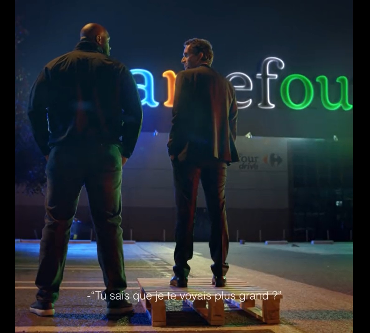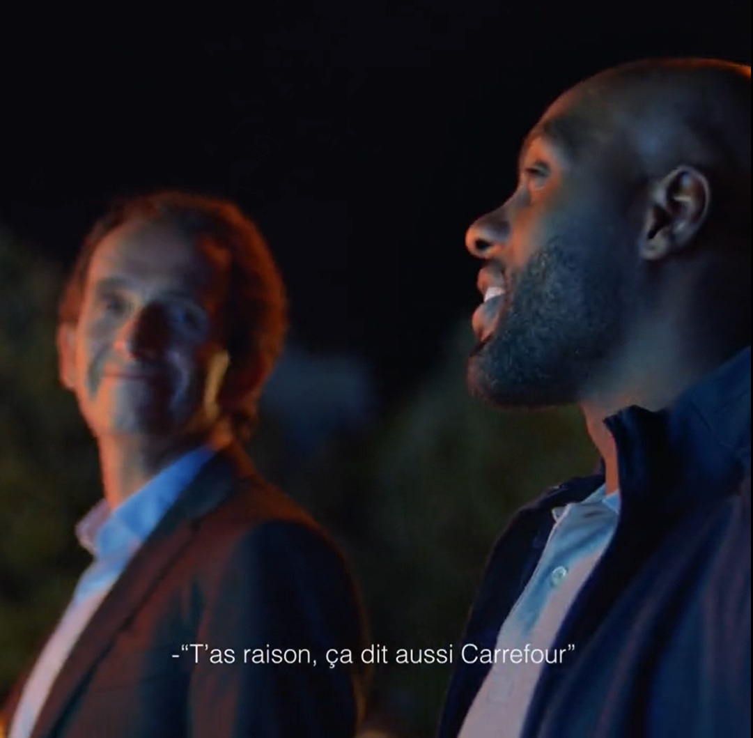 Aujourd’hui, le groupe Carrefour a dévoilé une vidéo mettant en scène son président Alexandre Bompard aux côtés de Teddy Riner devant un magasin dont l’enseigne lumineuse est aux couleurs des anneaux olympiques (bleu, jaune, noir, vert et rouge).