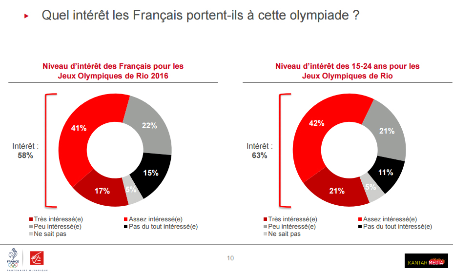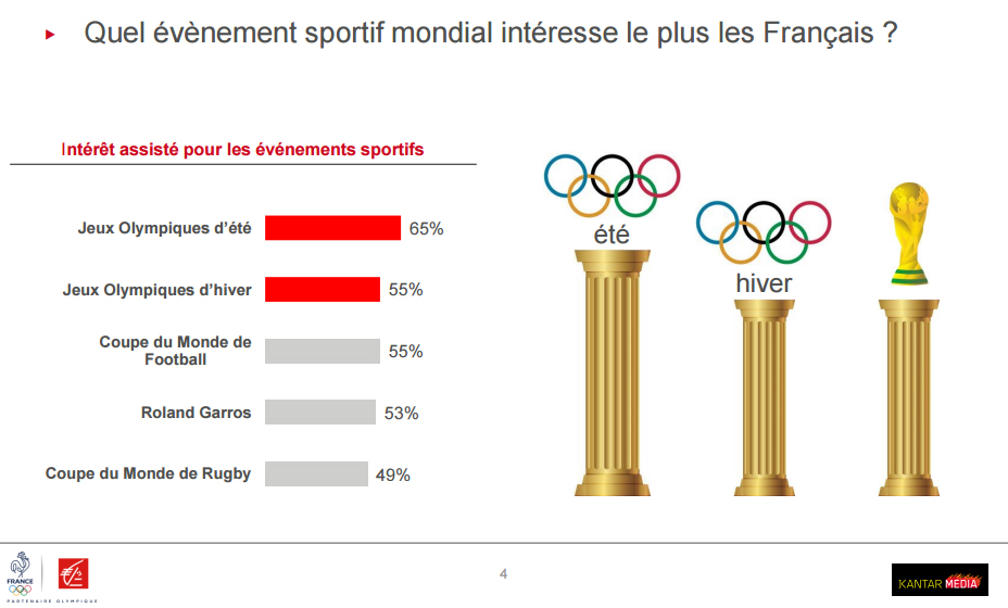 Dans son étude, Kantar Média révèle que les Jeux Olympiques d’été sont l’événement sportif mondial qui intéresse le plus les Français (65%) devant les Jeux Olympiques d’hiver et la Coupe du Monde de football à égalité (55%). La question posée était « Quel est le niveau d’intérêt que vous portez aux événements sportifs suivants ? » suivi d’une liste des 15 plus grands événements sportifs.
