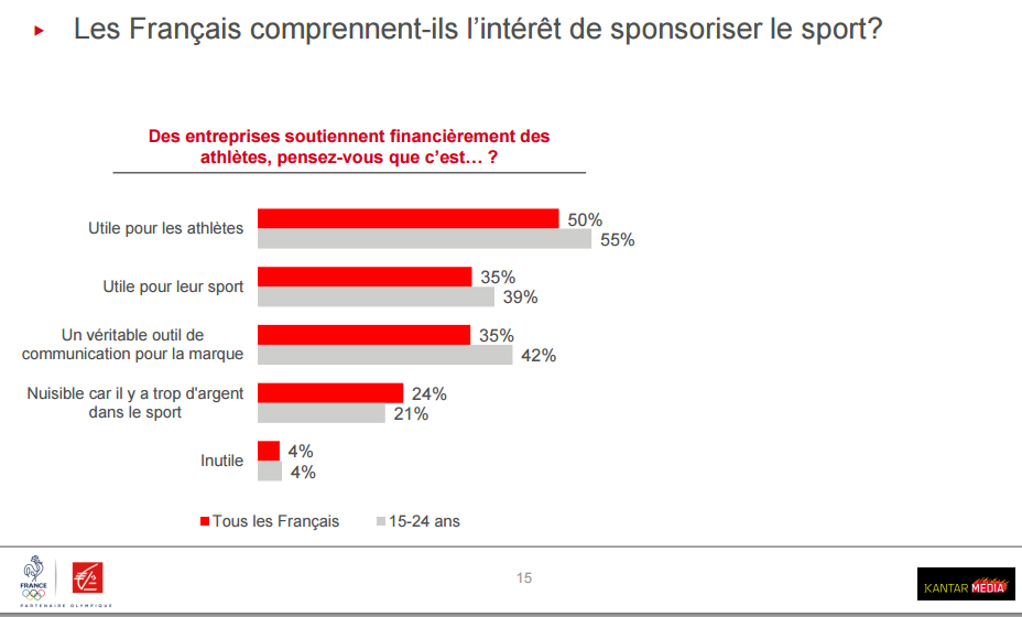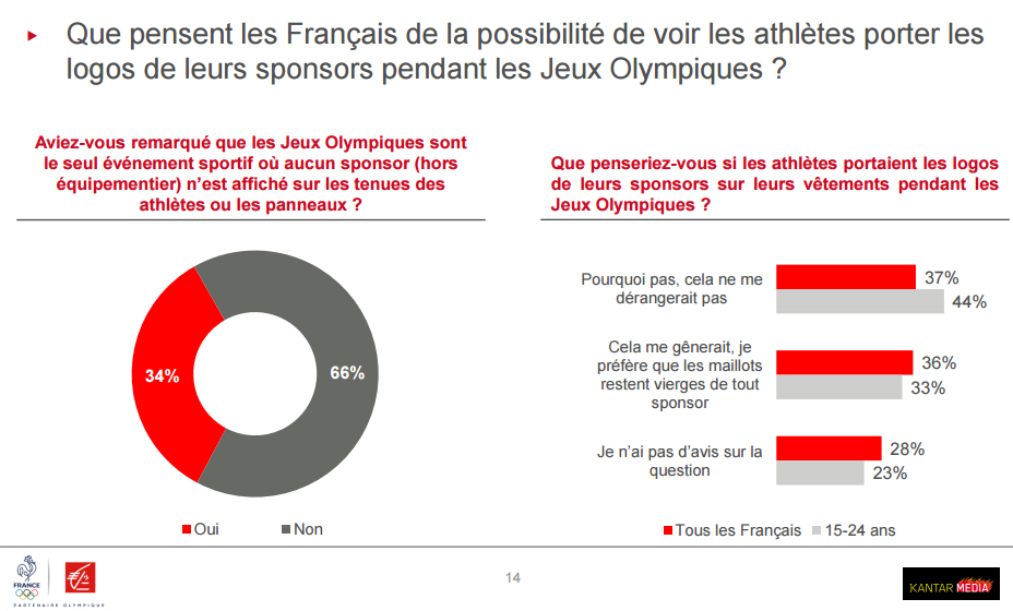 Alors que le CIO songerait à assouplir la règle 40 liée à la publicité et l’utilisation marketing des athlètes pendant les Jeux Olympiques, l’arrivée du sponsoring sur les tenues des athlètes est également une question qui se pose légitimement aujourd’hui. L’étude révèle ainsi que 66 % des Français avouent ne pas avoir remarqué l’absence des marques pendant les JO. Ils sont partagés sur l’idée de les autoriser : 37 % y sont favorables alors que 36 % s’y oppose. Les jeunes acceptent plus facilement cette idée (44 % n’y sont pas opposés). L’utilité du sponsoring est désormais bien perçue : 50 % des Français, et même 55 % des jeunes, comprennent l’intérêt pour les athlètes d’avoir un sponsor qui peut le soutenir, l’accompagner et lui permettre de mieux se concentrer sur ses objectifs sportifs.
