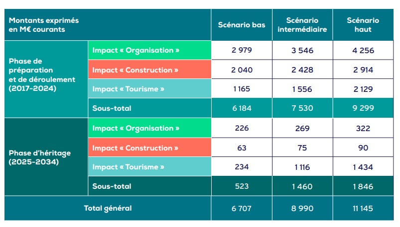 Dans l’étude (avril 2024) menée par Christophe Lepetit, Responsable des études économiques et des partenariats au CDES, on retrouve 3 catégories pour mesurer l’impact économique avec « Organisation », « construction » et « tourisme ».