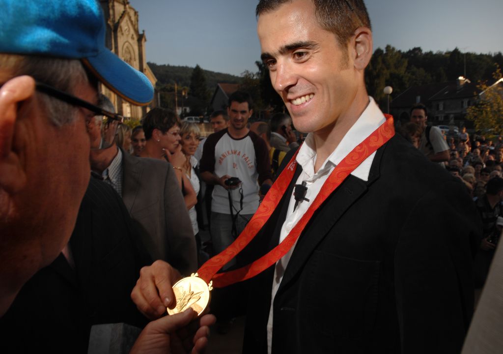 Julien Absalon, en 2008, chez lui, à Raon Aux Bois. Il présente à tous les habitants sa médaille d’or obtenue aux Jeux de Beijing. Crédit photo : Francis DEMANGE/Gamma-Rapho via Getty Images