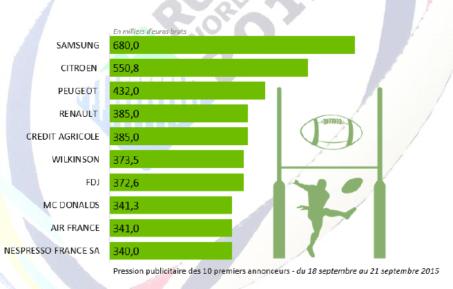 Pour les 8 premiers matchs, ce sont 87 annonceurs qui ont pointé le bout de leur nez sur les écrans publicitaires pour un montant brut de 14,1 millions d’euros. 14 constructeurs automobiles ont acheté de l’espace pour faire du secteur automobile le plus présent avec 23% de part de voix. Kantar Media précise cependant que c’est la Société Générale, Partenaire Officiel de la compétition, qui s’est offert le spot le plus coûteux (avant remise et négociation) à la mi-temps du match France – Italie. Sur le papier, le spot le plus élevé est proposé à 250 000€ sur TF1 et placé entre les hymnes et le coup d’envoi pour la Finale en cas de présence du XV de France.