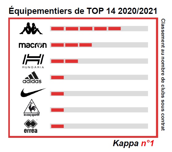 En TOP 14, 7 marques se disputent les 14 clubs cette saison 2020-2021. Kappa est l’équipementier numéro 1 avec 5 clubs sous contrat : Bayonne, Castres Olympique, Montpellier, Stade Français Paris et l’Union Bordeaux Bègles.