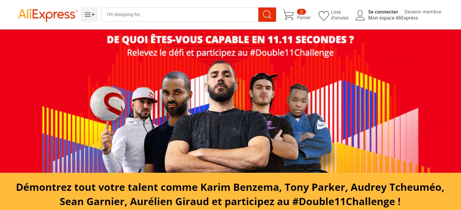 Karim Benzema, Tony Parker, Sean Garnier, Audrey Tcheuméo et Aurélien Giraud. Le casting des ambassadeurs de la campagne « Double 11 Challenge » d’AliExpress est plutôt impressionnant. En cumulant leurs communautés digitales respectives, le reach potentiel atteint plusieurs dizaines de millions de personnes.