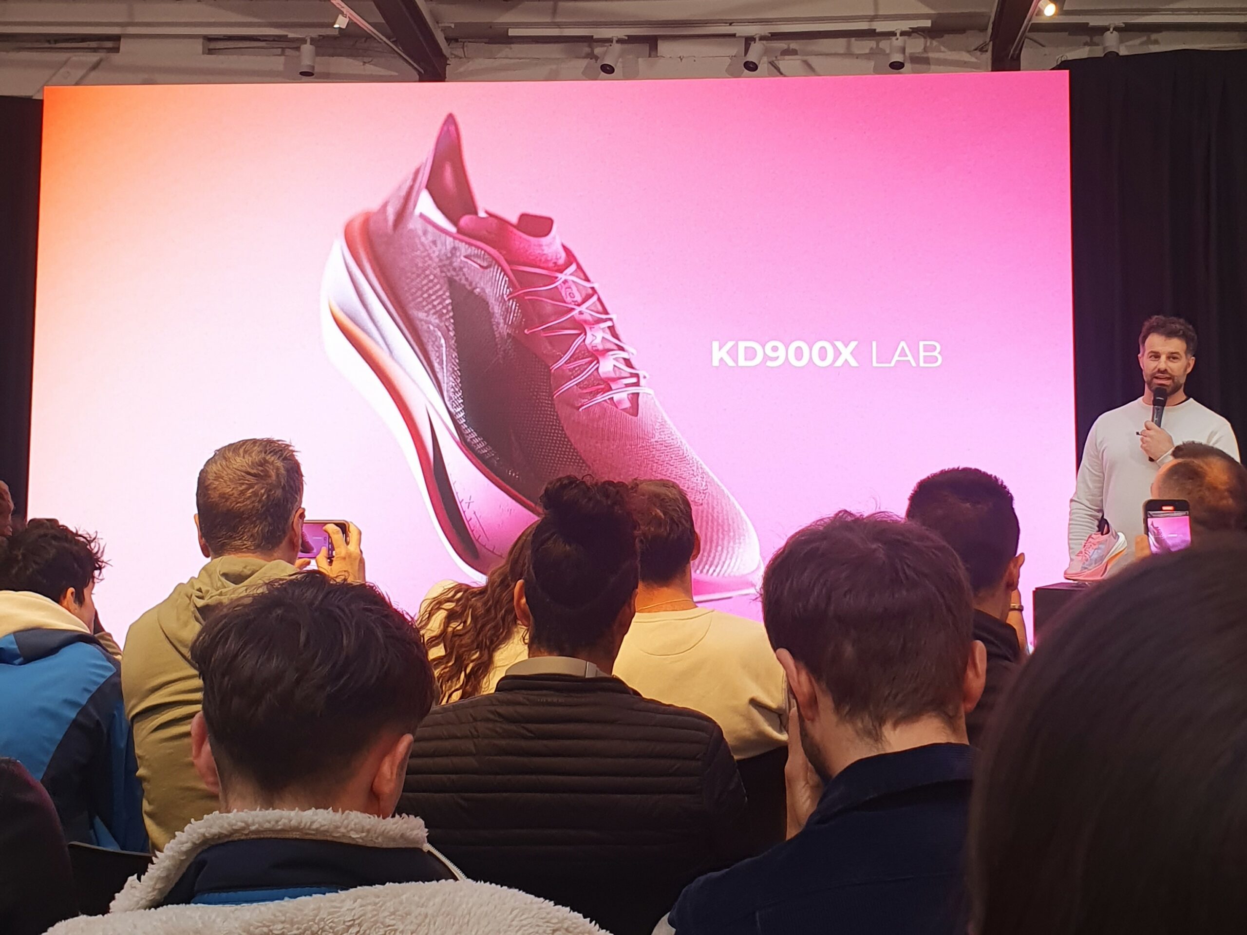« Vous n’êtes pas au bout de vos surprises, nous avons une surprise à vous présenter », affirmait enfin Pierre-Emmanuel avant de laisser le micro à David Drury, Shoes Technical Director. En effet, la sensation de la journée, c’était bien la présentation de la chaussure KD900X LAB. Il s’agit du tout dernier modèle à plaque carbone, porté par Jimmy Gressier, dernière recrue KIPRUN, lors de son record d’Europe du 5km route à Lille le 16 mars dernier (12’57). Conçue dans un coloris rose et un design agressif, la nouvelle pépite de KIPRUN « n’est pas une simple chaussure de compétition, elle est la paire la plus ambitieuse qu’on ait produit. La plaque carbone est introduite directement dans la semelle grâce à la technologie SCF, ce qui signifie pas de colle entre les éléments ». Avec cette annonce, KIPRUN marque un grand coup dans le monde du haut-niveau. « La paire est destinée aux coureurs qui exigent beaucoup de leurs chaussures », renchérit David Drury. Elle sortira en septembre 2025 au grand public, au prix de 300€ pour 167g.
