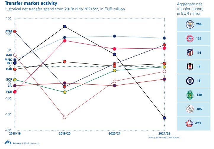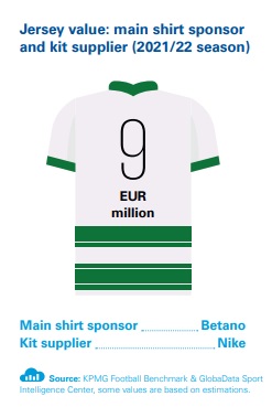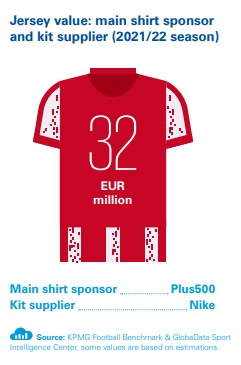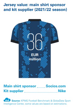 Dans le rapport, KPMG s’intéresse à d’autres variables comme le résultat net, l’activité sur le marché des transferts, la valeur des effectifs, les réseaux sociaux ou encore la valorisation des maillots (contrat équipementier + sponsor principal) pour la saison en cours.