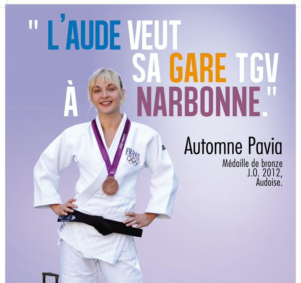 Afin de soutenir la candidature de l’Aude dans le dossier de l’installation d’une gare TGV, le Conseil Général et le Grand Narbonne ont lancé une grande campagne de publicité nationale utilisant l’image de la médaillée olympique (bronze) en judo Automne Pavia. Un partenariat entre la judokate et le Conseil Général de l’Aude sera voté et « officialisé le 22 octobre prochain » nous a précisé Yvon Le Gall, Directeur de la Communication du Conseil Général de l’Aude.