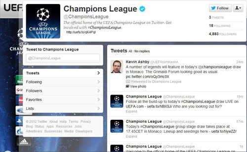 A l’occasion du tirage au sort de la Ligue des Champions aujourd’hui (17h40) et de l’Europa League demain (13h), l’UEFA a lancé le compte twitter officiel de la Coupe aux grandes oreilles, la Ligue des Champions, et sa petite soeur, l’Europa League pour nous permettre de ne rien manquer des deux compétitions. Chaque compte essayera « d’apporter la meilleure couverture de la compétition en 140 charactères…». Welcome on board !