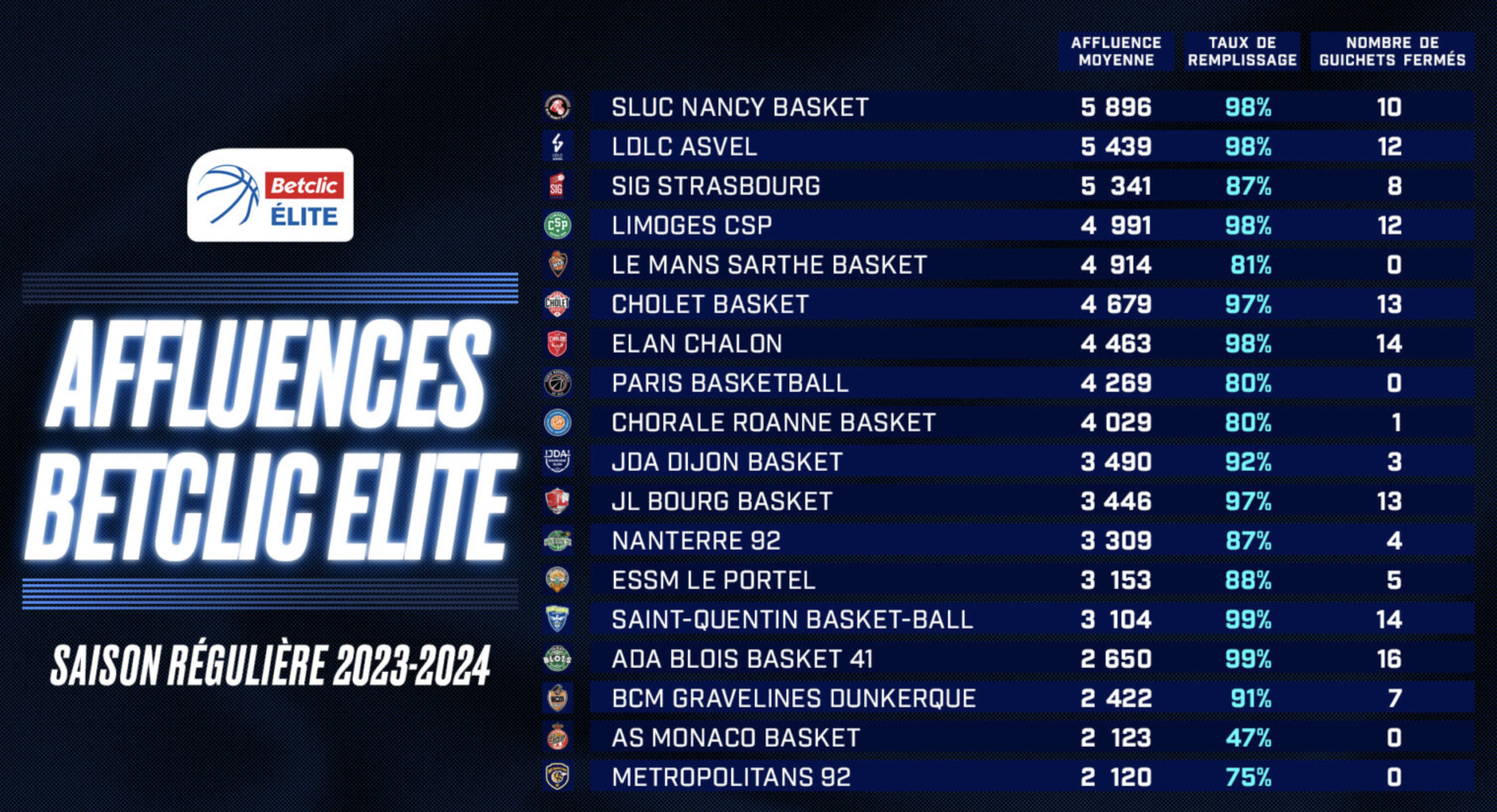 Sur la saison régulière 2023-2024, près de 1,2 million de spectateurs se sont rendus dans les salles de Betclic Elite avec un taux de remplissage record de 88% (87% la saison passée). Au total, la Ligue Nationale de Basket explique que 132 rencontres se sont disputées à guichets fermés en Betclic Elite.