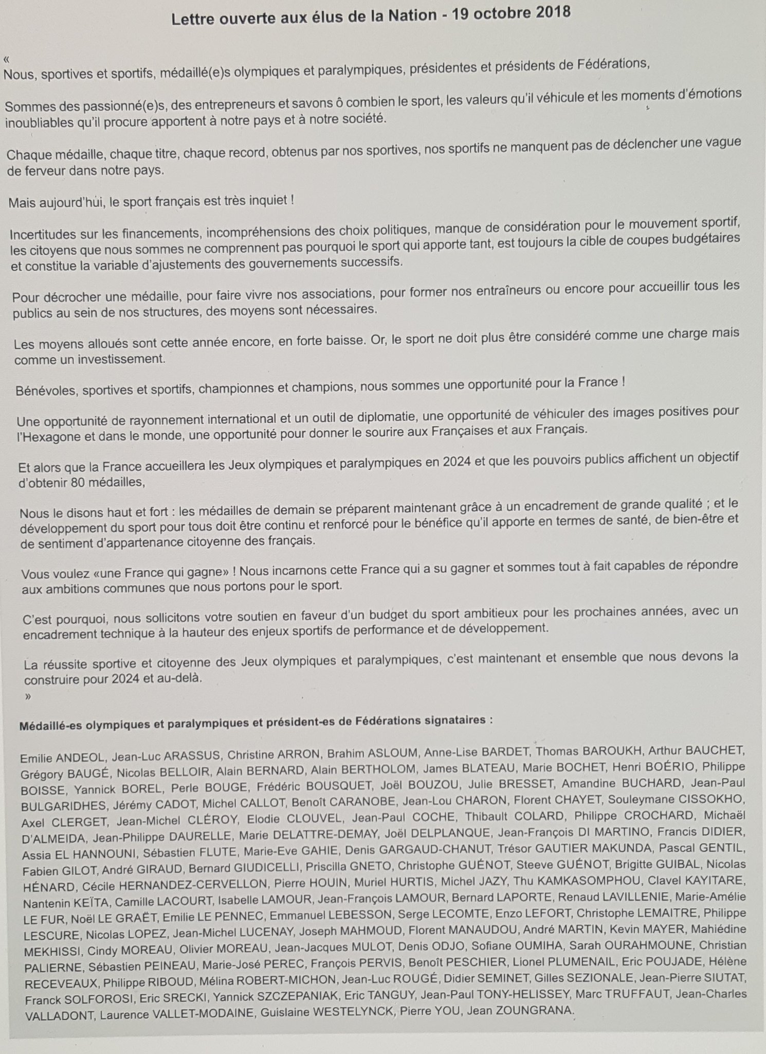 Chers athlètes, j’entends votre inquiétude. Je vous garantis des moyens équivalents à 2018 pour le sport et je serai à l’Assemblée lors du vote du budget afin d’obtenir des crédits supplémentaires pour un projet axé sur la haute performance et le développement des pratiques