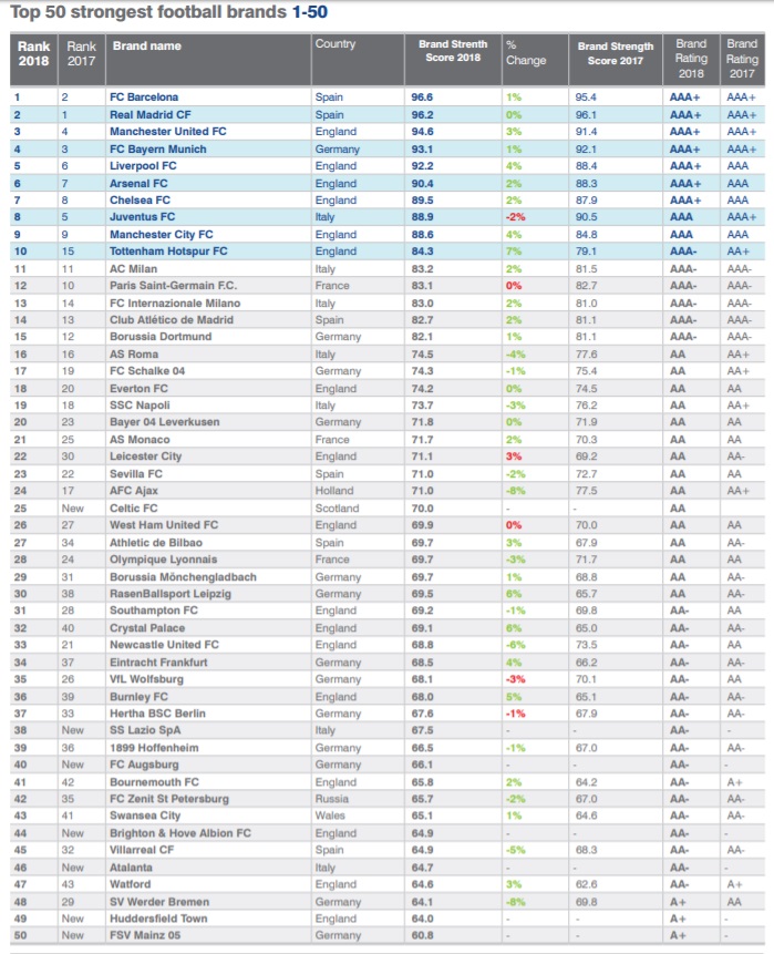 TOP 50 strongest football brands (Brand Finance 2018)