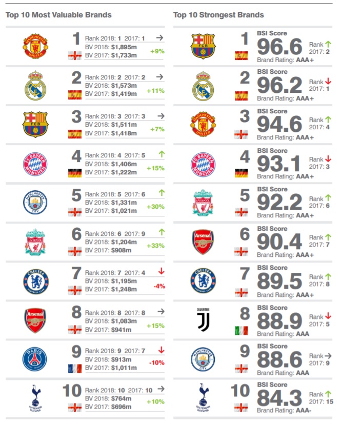 Pour la saison 2017/2018, Brand Finance place une nouvelle fois le même trio de tête pour les « Most Valuable Brands » à savoir les marques les plus valorisées des clubs de football.