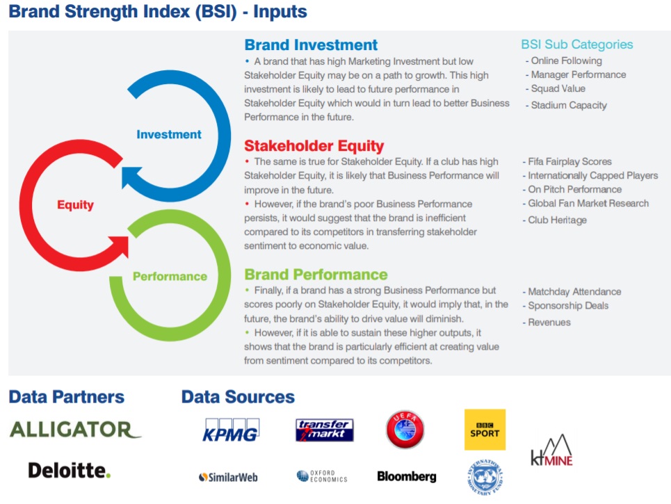 En parallèle à la valorisation des marques club, Brand Finance s’intéresse également la force des marques grâce à son BSI Score qui s’appuie sur les performances sportives, la situation financière, les résultats commerciaux et les investissements.