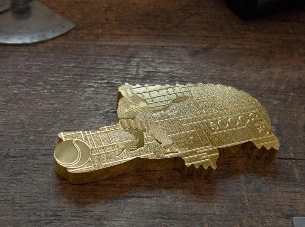 Pour célébrer les 90 ans de Lacoste, Joaquin Jimenez, Graveur Général de la Monnaie de Paris, s’est plongé dans les archives de la maison et a imaginé une monnaie de 1 Kilo en Or en forme de crocodile.