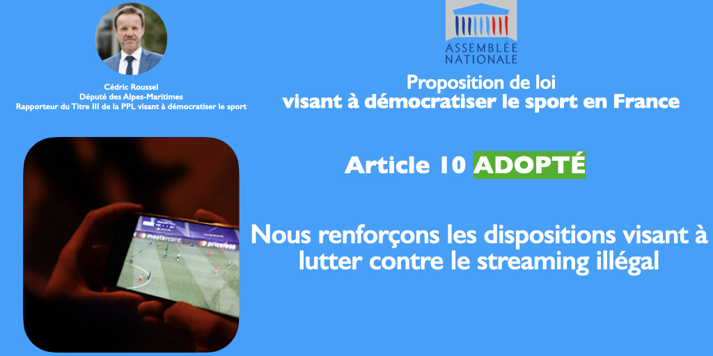 L’interruption du fait de la crise Covid de l’examen au parlement du projet de loi Audiovisuel déposé par M. Franck Riester n’avait pas permis l’adoption en 2020 des dispositions de lutte contre le piratage. La proposition de loi (PPL) « Démocratiser le sport », déposée le 26 janvier par Mme la députée Céline Calvez et ses collègues du groupe LREM, a repris de façon active et résolue les travaux afin de faire adopter un système adapté à la lutte contre le piratage du sport (article 10 de la PPL).