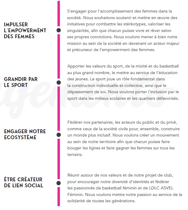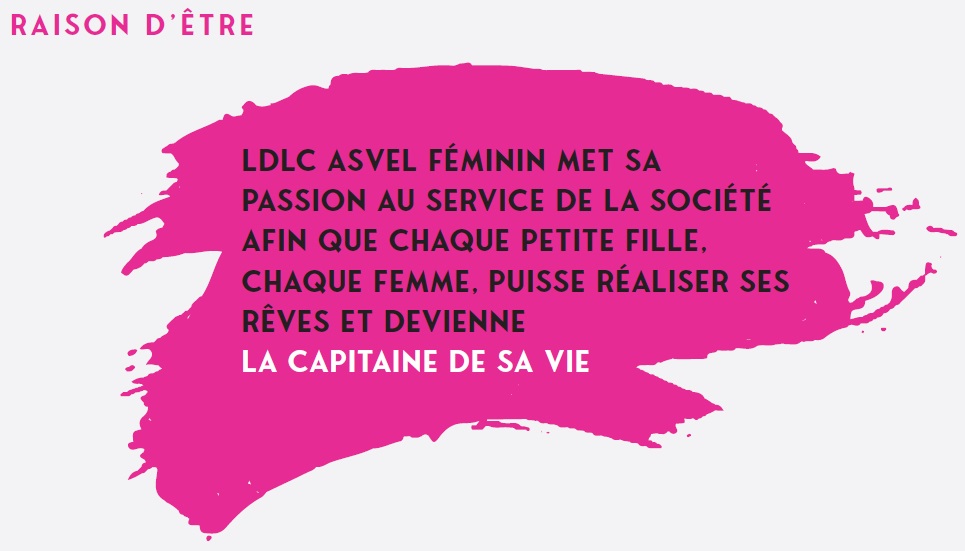 A travers la raison d’être « LDLC ASVEL Féminin met sa passion au service de la société afin que chaque petite fille, chaque femme, puisse réaliser ses rêves et devienne la capitaine de sa vie », le club souhaite s’impliquer encore plus sur la notion d’accomplissement des femmes.