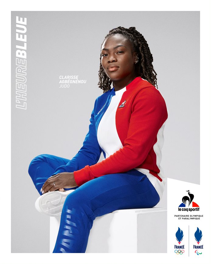 « Le design asymétrique des rayons bleu-blanc-rouge présent sur les pièces, repris d’un croquis spontané esquissé par son athlète ambassadrice Clarisse Agbégnénou, représente ces lignes d’une route qui n’est jamais directe ni simple. Ces chemins difficiles se métamorphosent en rayons lumineux en cas de victoire, rayons du soleil qui sont aussi un clin d’œil à ceux présents sur le logo de la marque. Cette asymétrie tricolore c’est aussi le symbole du drapeau posé sur les épaules pour aller crier son amour de la victoire et de son pays » précise le communiqué.
