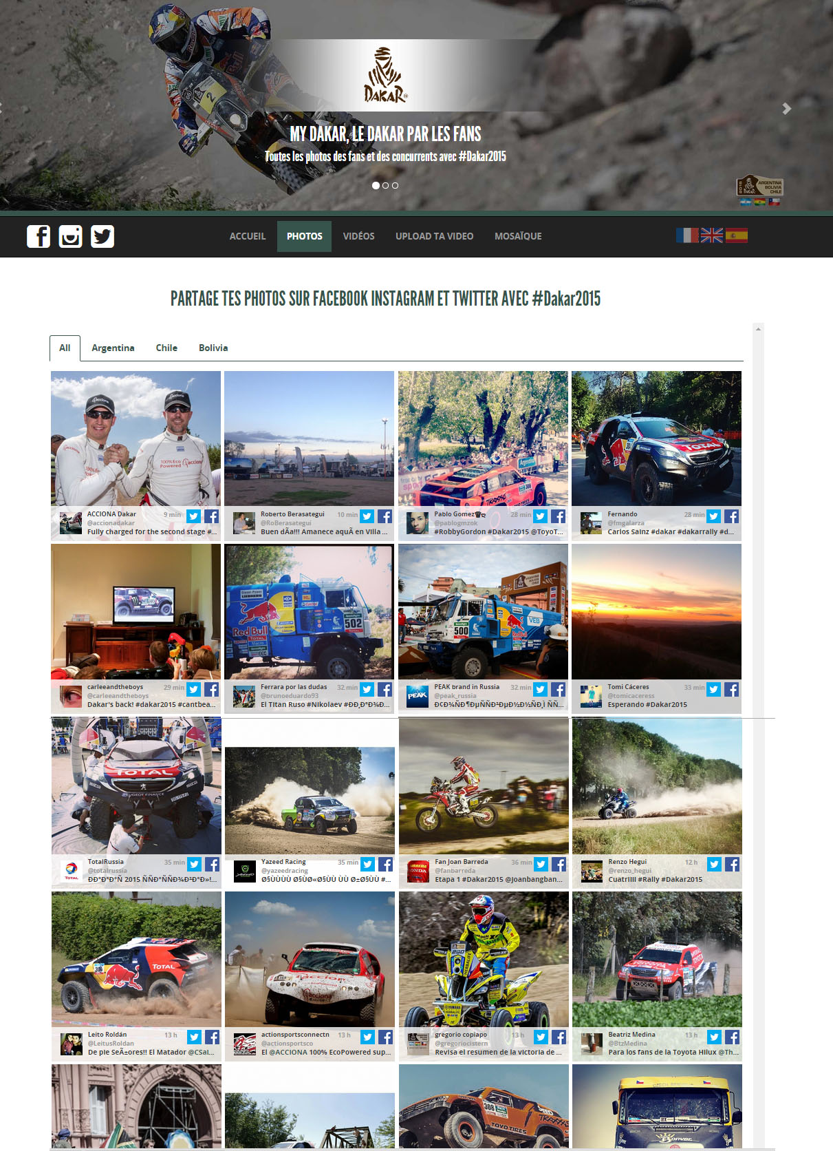 Le site officiel dakar.com, disponible en 3 versions linguistiques, rassemble l’intégralité des informations pour suivre la course : le live tracking avec les temps de passage aux CP, les classements en instantané, des galeries photos, les interviews en fin d’étape et les compte-rendus de course, ainsi que des témoignages d’amateurs qui expriment leur vécu du Dakar. L’an dernier, le site officiel a attiré quelques 7,2 millions de visiteurs uniques et l’application officielle a été téléchargée 508 000 fois. Le site officiel du Dakar proposera également le Social Wall « My Dakar » agrégeant photos et vidéos envoyées sur Facebook, Twitter ou Instagram avec le hashtag #Dakar2015.