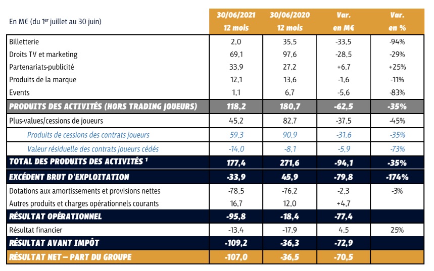 L’Excédent Brut d’Exploitation (EBE) est négatif pour la première fois depuis l’entrée au Groupama Stadium et s’établit à -33,9 M€ au 30 juin 2021. Le résultat avant impôt s’établit à -109,2M€, contre -36,3M€ pour l’exercice précédent.