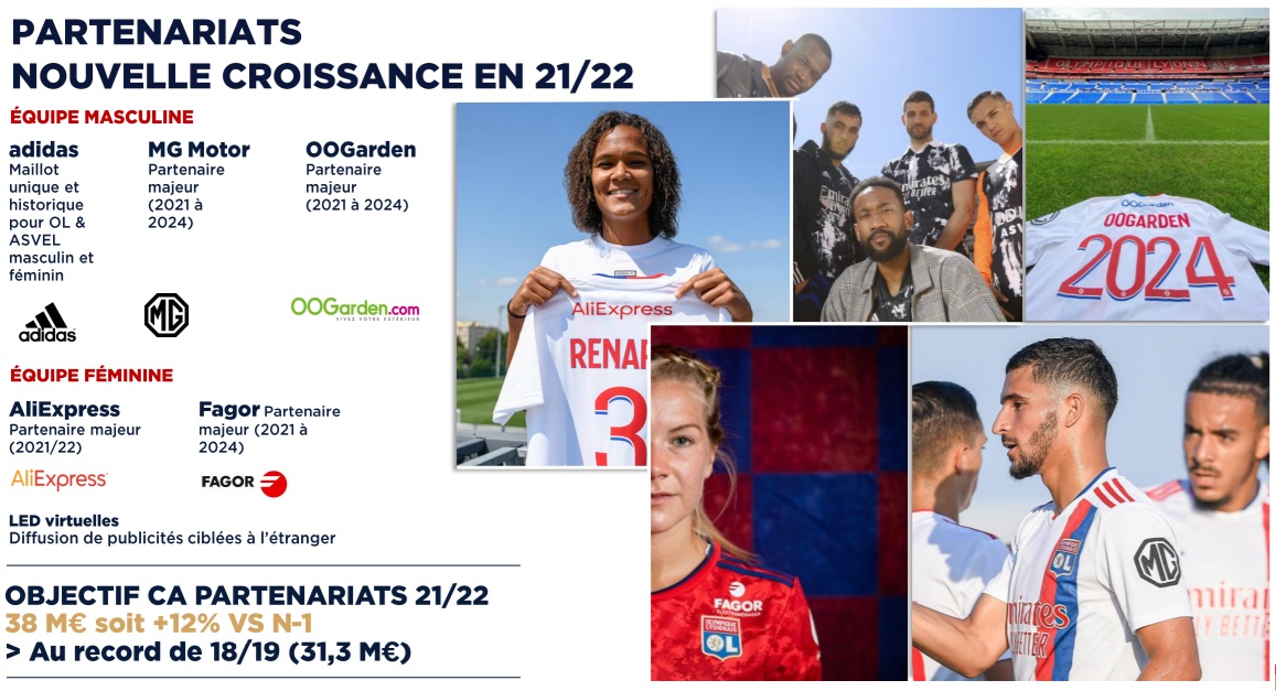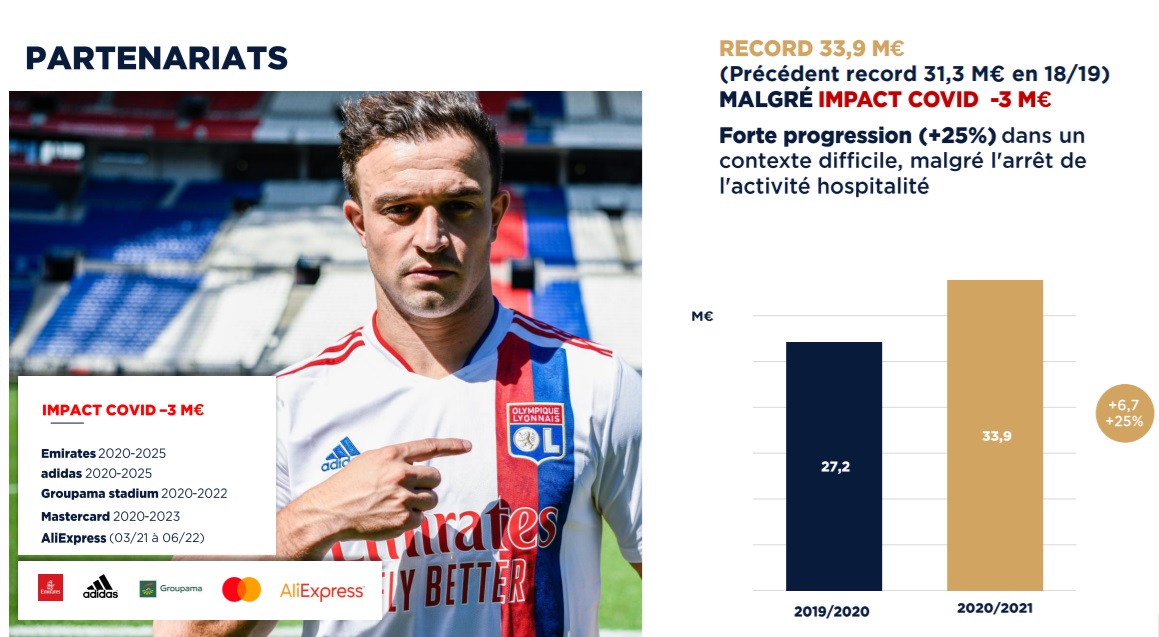 Concernant le sponsoring et les partenariats, OL Groupe enregistre un record malgré la crise avec des revenus historiques à 33,9 millions d’euros. Un chiffre qui s’explique par l’entrée en vigueur du contrat signé avec Emirates pour la face avant du maillot. Pour la saison 2021/2022 en cours, le club pourrait atteindre un nouveau record proche des 38M€ grâce à la signature de nouveaux contrats avec MG Motor, OOGarden, AliExpress et Fagor.