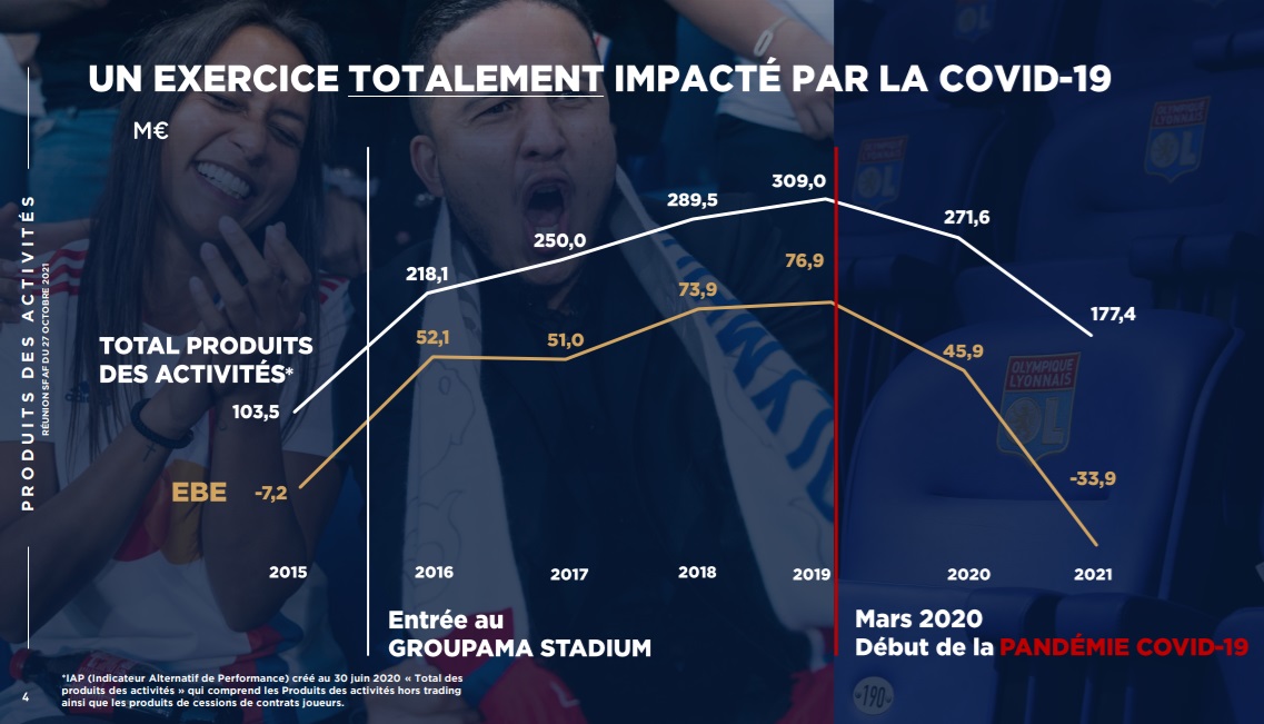« Le Groupe estime ainsi, sur le plan financier, à environ 150M€ le montant total des impacts directs et indirects de la pandémie, y compris la défaillance de Mediapro et le manque à gagner lié à l’absence de participation en Champions League 2020/21 (base 1/8 de finale) sur le total des produits des activités (hors trading joueurs) » précise OL Groupe. L’absence en Ligue des Champions était la conséquence de l’arrêt prématuré du championnat en 2020 suite à l’arrivée de la crise sanitaire.