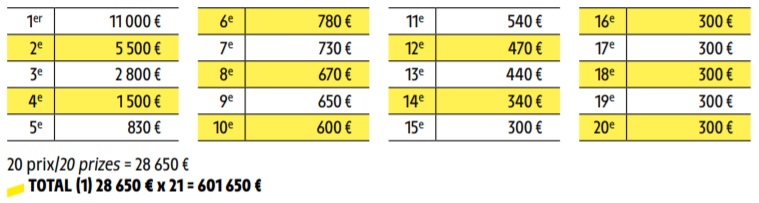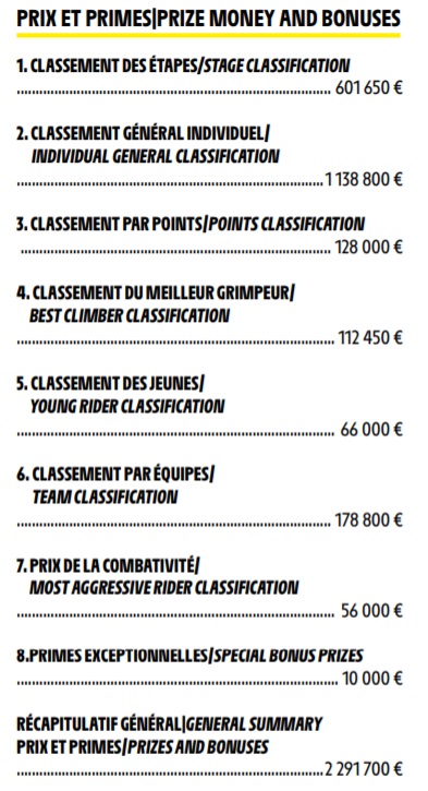20 000€ pour le vainqueur final | 300€/jour avec le maillot blanc sur les épaules. Lors de chaque étape, le premier “jeune” arrivé touche la somme de 500€.