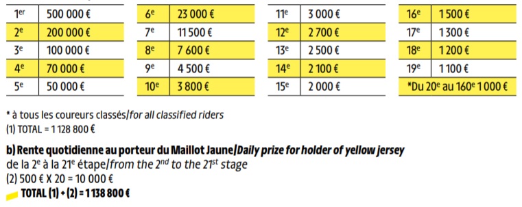 En rapportant le Maillot Jaune sur les Champs Elysées, le vainqueur du classement général final individuel empochera la somme de 500 000 euros. Le second du classement général individuel empochera 200 000 euros et le troisième 100 000€. Le 10ème du classement général empochera la somme 3 800€ et le 20ème 1000€, une somme versée aux coureurs jusqu’à la 160ème place.