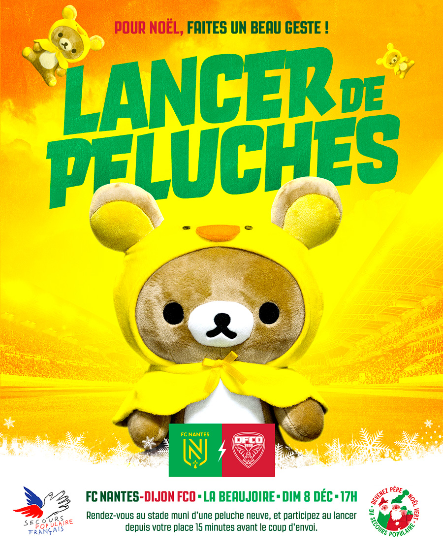 Le FCN organisera un lancer de peluches lors de son match à la Beaujoire face au Dijon FCO, le dimanche 8 février (17h). Les fans nantais sont invités à apporter et à lancer leurs peluches qui iront directement aux familles les plus démunies.