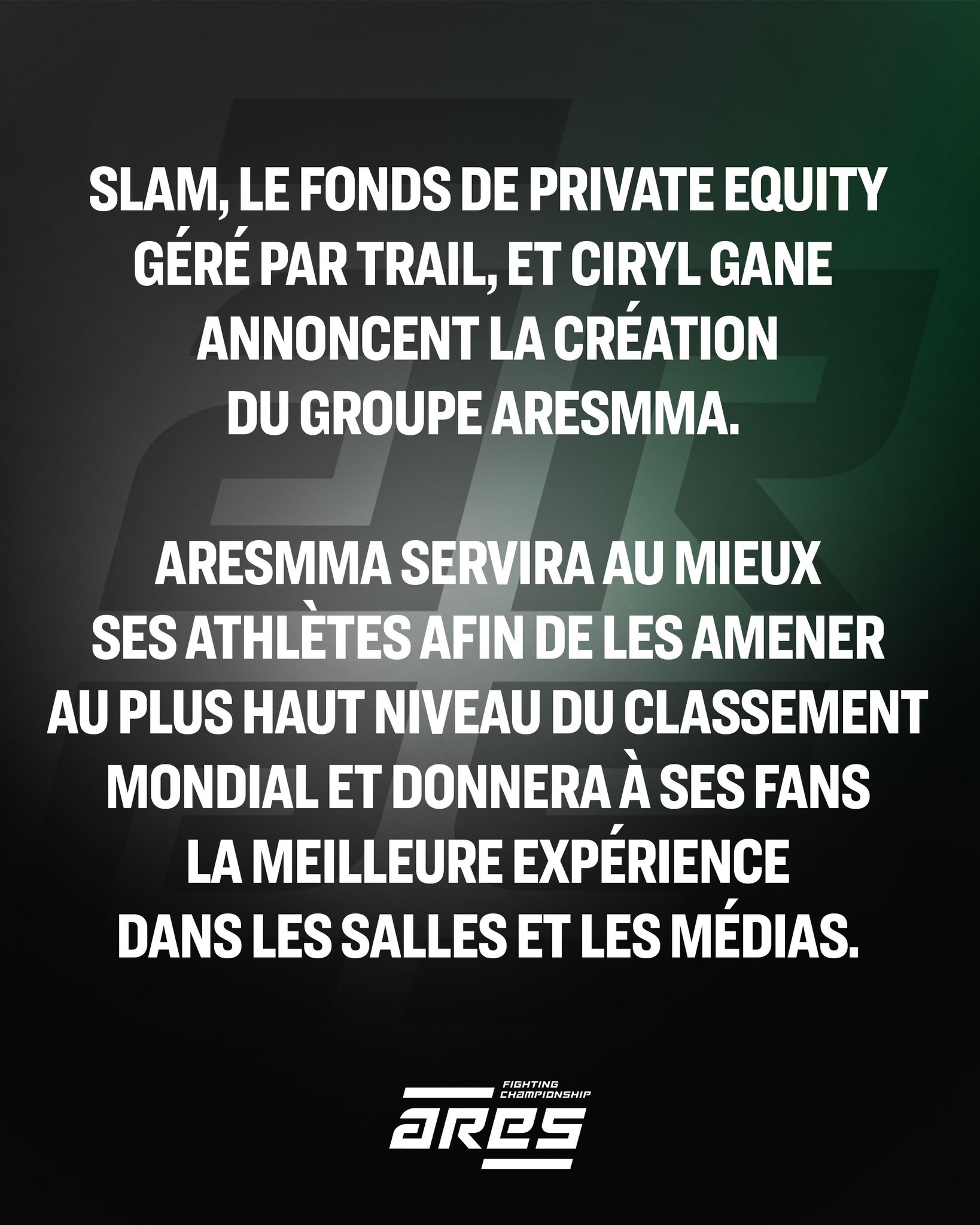 Toutes ces activités sont désormais regroupées au sein du groupe AresMMA. « C’est un jour important pour le MMA français qui a l’opportunité de franchir une nouvelle étape. En m’associant avec SLAM et en m’investissant dans AresMMA, je souhaite contribuer autrement à la réussite de mon sport, au potentiel de croissance unique alors que la discipline est à un tournant en France et en Europe » explique Ciryl Gane dans un communiqué.