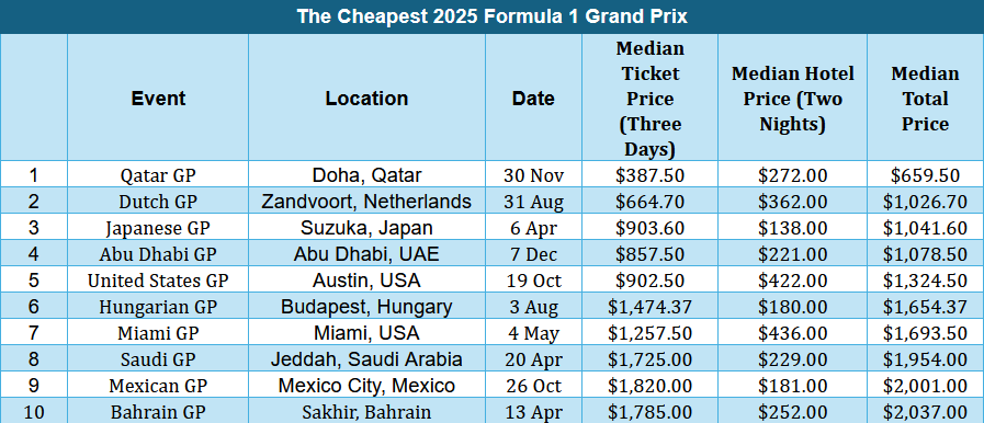 « Assister à un Grand Prix de Formule 1 est pour beaucoup un rêve unique, mais le réaliser peut être coûteux. Ces données donnent des indications sur les courses qui pourraient être davantage abordables, surtout si vous planifiez (cette expérience) à l’avance et choisissez le bon forfait. Cela dépend aussi de votre lieu de résidence : en tant que fan européen, vous pourriez envisager le GP du Qatar ou le GP des Pays-Bas, tandis que ceux basés aux USA devraient plutôt se tourner vers les événements d’Austin ou de Miami. » (Nabil Ansari, VP of Outreach & Acquisitions // Hudson Reporter)