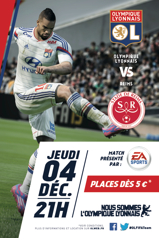 A l’occasion du match de Ligue 1 entre l’Olympique Lyonnais et le Stade de Reims demain au Stade de Gerland, EA SPORTS et son jeu FIFA 15 seront mis à l’honneur tout au long de la soirée. Des activations confiées à l’agence Uniteamsport.