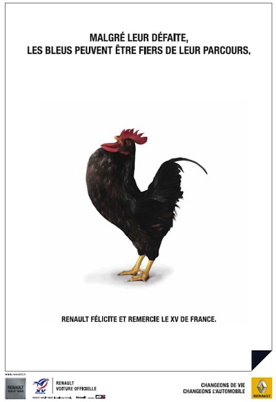 Au lendemain de la défaite du XV de France en finale de la Coupe du monde en Nouvelle-Zélande, l’ensemble des annonceurs passent leur message de félicitations aux joueurs. Cependant L’EXPRESS a dévoilé la pub qu’aurait diffusé le constructeur automobile français Renault en cas de victoire des Bleus.