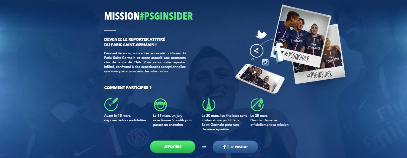 Pour vous inscrire et tenter de devenir le « Paris Saint-Germain Insider », il faudra vous rendre sur le site www.psginsider.fr et présenter vos motivations. Cinq candidats seront retenus pour passer un entretien décisif devant le jury composé de Jennifer Madiot (Responsable Promotion et Sponsoring PMU), Kuider Akani (Responsable Marketing Online PMU), Cynthia Marcou (Responsable partenariats et activations PSG) et Anthony Baca (Responsable pôle médias PSG).