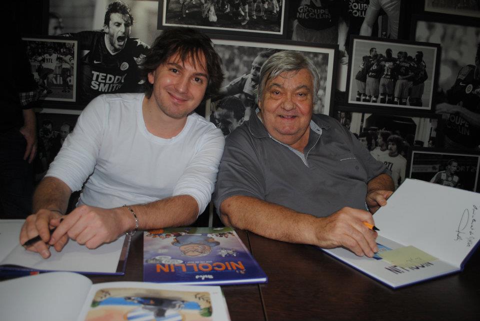 Plus de 4h30 de dédicaces, des centaines de photos et un millier d’autographes ! La séance de dédicaces du Président Louis Nicollin et de Dadou, l’auteur de la bande dessinée « Nicollin une vie de foot ! » a tenu toutes ses promesses et bien plus encore. Nous vous avions présenté cette BD dans nos « 10 idées cadeaux Ligue 1 de dernière minute ». Commencée à 14h15, l’après-midi s’est terminée peu avant 19h ! Ce sont plus de 1000 BD qui ont été dédicacées en ce mercredi 28 décembre qui restera comme le record absolu en terme de séance de dédicaces dans l’histoire du club ! La star à Montpellier c’est Nicollin ! A 10€ pièce la BD, le président à généré plus de 10 000€ de chiffre d’affaires soit 2222€ par heure. Voilà un président qui sait « mouiller le maillot » pour son club (voir photo ci-dessous ;-) ) La BD est disponible ici.