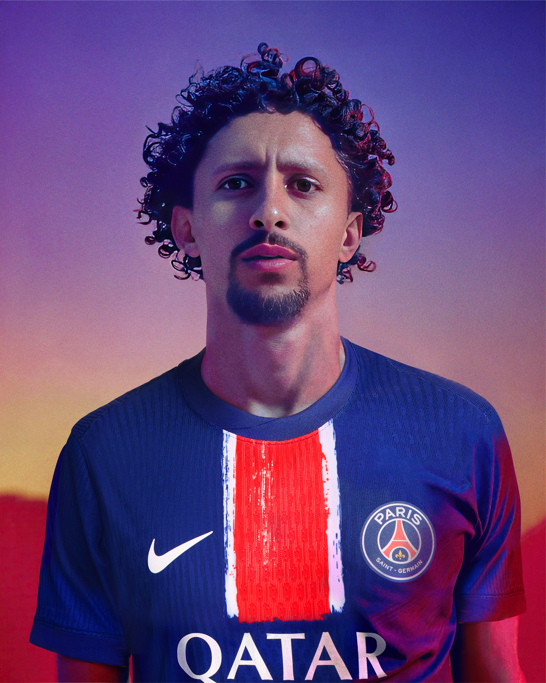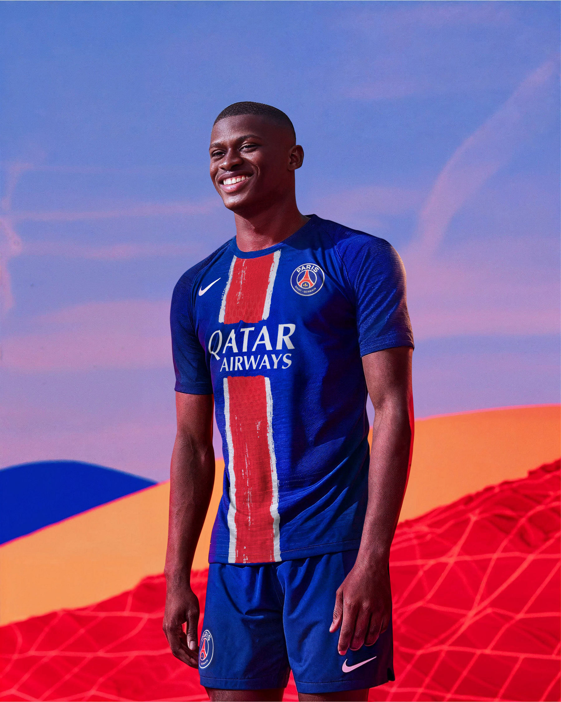 « Inspiré par l’art urbain qui imprègne le Grand Paris, cette nouvelle tunique retrouve l’emblématique bande centrale rouge entourée de fines lignes blanches, réinterprétées et dessinées d’un geste vif, comparables à des coups de pinceau. Un clin d’œil original qui reflète parfaitement l’identité disruptive du club parisien, reconnu comme le club de la nouvelle génération » précisent l’équipementier et le club parisien.