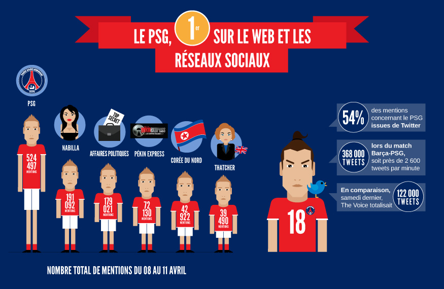 Havas Sports & Entertainment et KantarSport ont décidé de collaborer pour mener une étude sur la prise d’importance du Paris Saint-Germain au sein de l’actualité française. Malgré son élimination de la Ligue des Champions mercredi soir face au Barça, le club se retrouve en tête des « Charts » médiatique de la semaine passée. Avec plus de 500 000 mentions du 8 au 11 avril 2013, le PSG est le sujet numéro 1 sur le web et les réseaux sociaux devant les affaires politiques, le décès de Margaret Thatcher ou encore le « Allô quoi » de Nabilla qui était l’invitée du Grand Journal de Canal+ jeudi soir dernier. « Au delà de ses succès sportifs et du formidable engouement populaire et médiatique engendré par ses joueurs vedettes, le PSG est devenu cette saison un véritable sujet d’actualité ! En effet, chaque semaine nous constatons au travers de l’analyse des retombées plurimédias la montée en puissance du club francilien qui s’impose comme un véritable phénomène médiatique » déclare Virgile Caillet, Directeur de KantarSport.