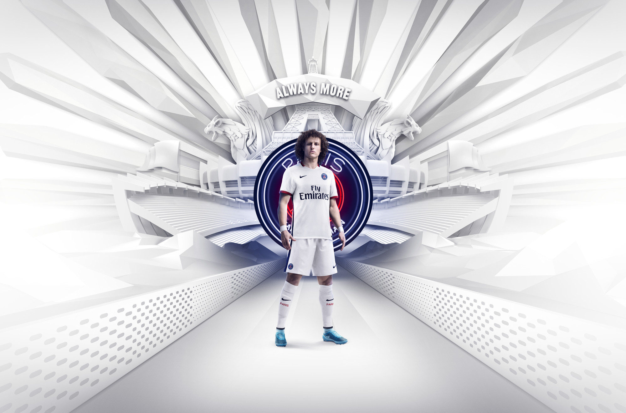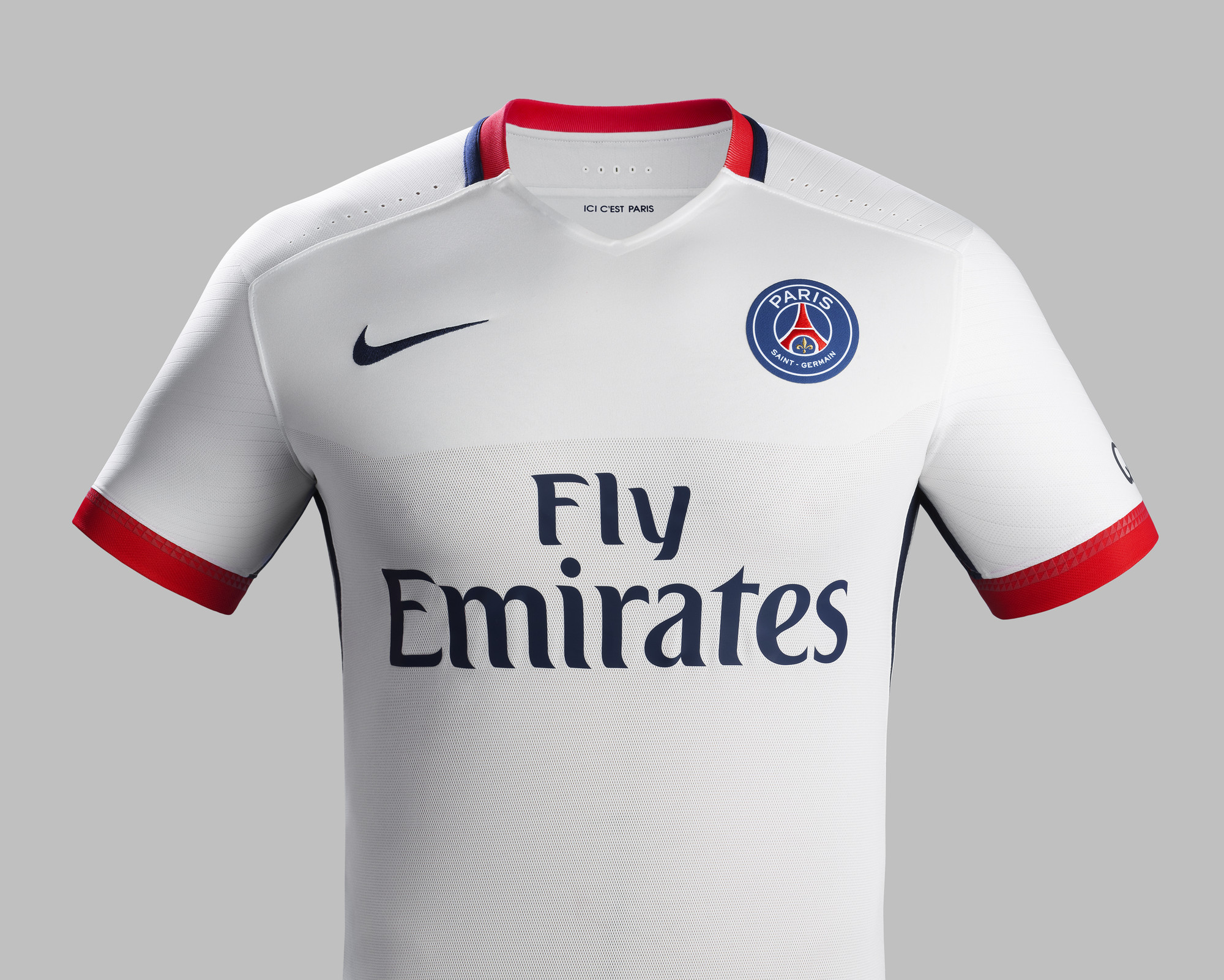 Le nouveau maillot extérieur est doté d’un torse blanc classique et d’un col en V moderne, complété par une bande rouge et bleue à l’arrière du cou afin d’y apposer les trois couleurs traditionnelles du club. Une série de fines bandes rouges prend place sur les épaules et sur les manches. Les manches affichent deux teintes de rouge pendant que des bandes bleu marine sont présentes sur les flancs et se prolongent sur le short. La devise du club, « ICI C’EST PARIS », s’affiche avec fierté dans le cou.