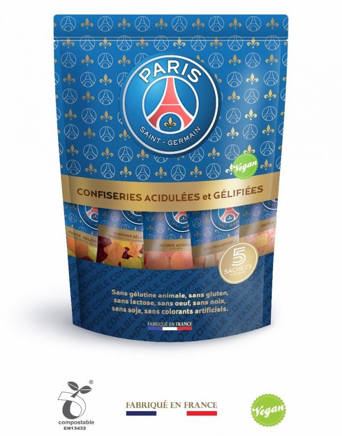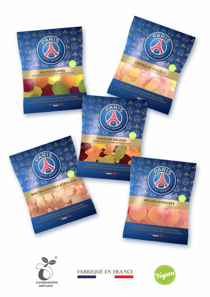 Dans le détail, cette collaboration a donné naissance à 5 sachets de bonbons différents (fruits gélifiés, frites acidulées, oursons gélifiés, bouteilles colas acidulés et pêches acidulées). « Le PSG a été séduit par la petite startup locale, éthique et éco-responsable » nous précise Sami Djaber, PDG de 3D sas. « Des bonbons vegan dans un emballage compostable est une première mondiale qui profite au PSG. » Côté prix, le paquet de 5 sachets de bonbons PSG est vendu au prix de 5,50€ (150g).
