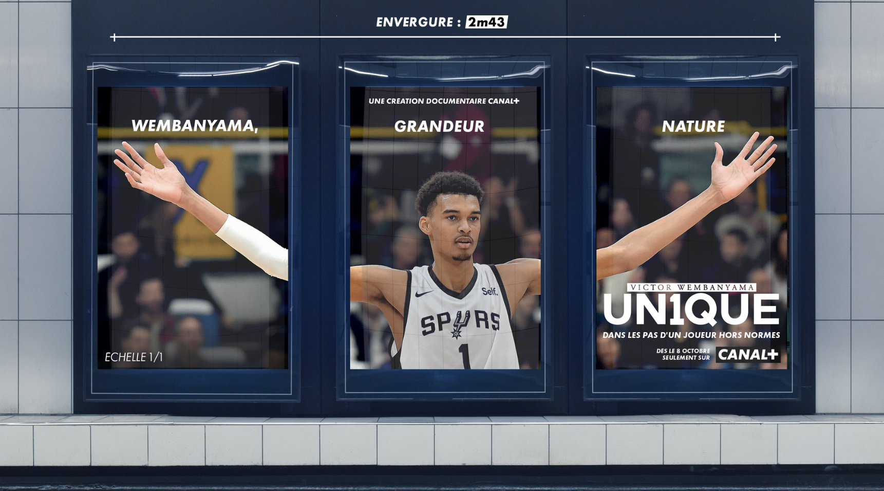 Wembanyama a le bras long ! Une taille de 2,24 m qui va évidemment inspirer les annonceurs. Il y a quelques semaines, CANAL+ dévoilait une campagne « grandeur nature » pour promouvoir le documentaire « UN1QUE » consacré à Wemby.
