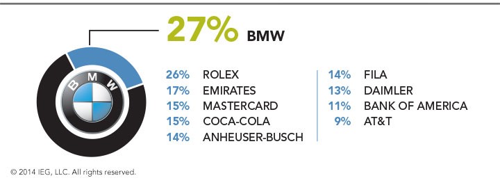 Selon cette étude, c’est la catégorie « automobile » qui domine le secteur du sponsoring golf au niveau mondial. Les marques auto sont ainsi 4,4 fois plus présentes que les autres secteurs d’activités. Du côté des marques, c’est BMW qui est le sponsor le plus actif du golf mondial avec 27% des évènements ou athlètes possédant un contrat avec une marque automobile. Rolex suit avec 26% des évènements ou athlètes possédant un contrat avec un horloger.