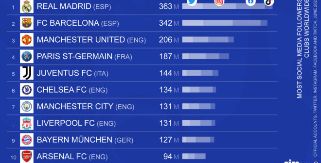 Dans sa dernière lettre hebdomadaire, l’Observatoire du Football CIES dresse le classement des 100 clubs de football les … Lire la suite de Le TOP 100 des clubs de football les plus suivis sur les réseaux sociaux Instagram, Twitter, Facebook et TikTok (juin 2023 – CIES)