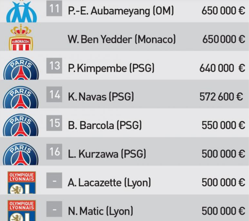 11. Pierre-Emerick Aubameyang (OM) 650 000 €
