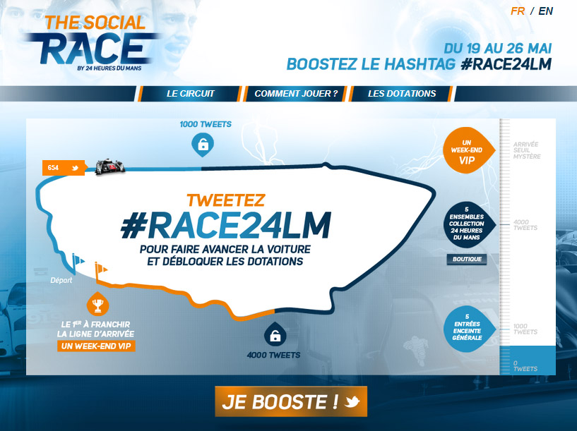 Jusqu’au lundi 26 mai, le principe de la « Social Race 24LM » est simple. Il faut booster le hashtag #Race24LM pour faire avancer la voiture virtuelle. En atteignant les seuils de 1 000 et 4 000 tweets envoyés, les Twittos participeront automatiquement à un tirage au sort pour tenter de gagner des billets Enceinte Générale et des ensembles de vêtements. L’internaute qui franchira en premier la ligne d’arrivée mystère (après 4 000 tweets) avec son message contenant le hashtag #Race24LM remportera le week-end VIP.