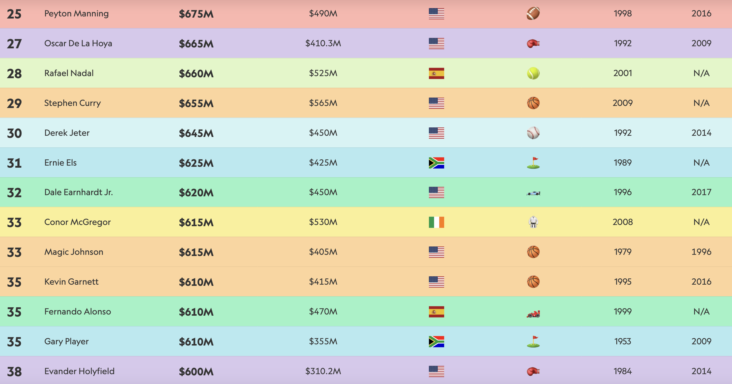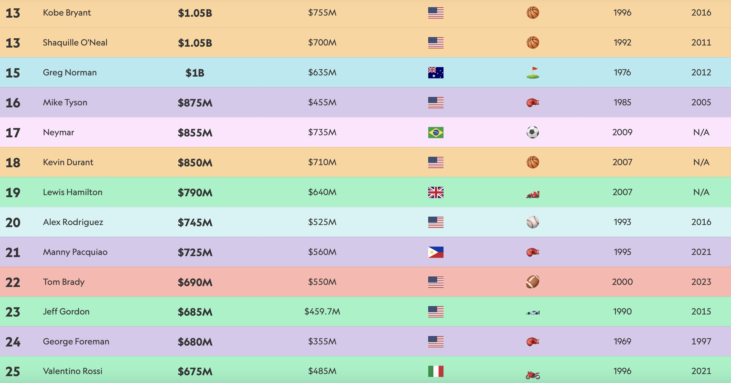 Floyd Mayweather (8e avec 1,41 milliard de dollars) et Roger Federer (9e avec 1,38 milliard de dollars) sont les seuls représentants de la boxe et du tennis dans ce top 10.