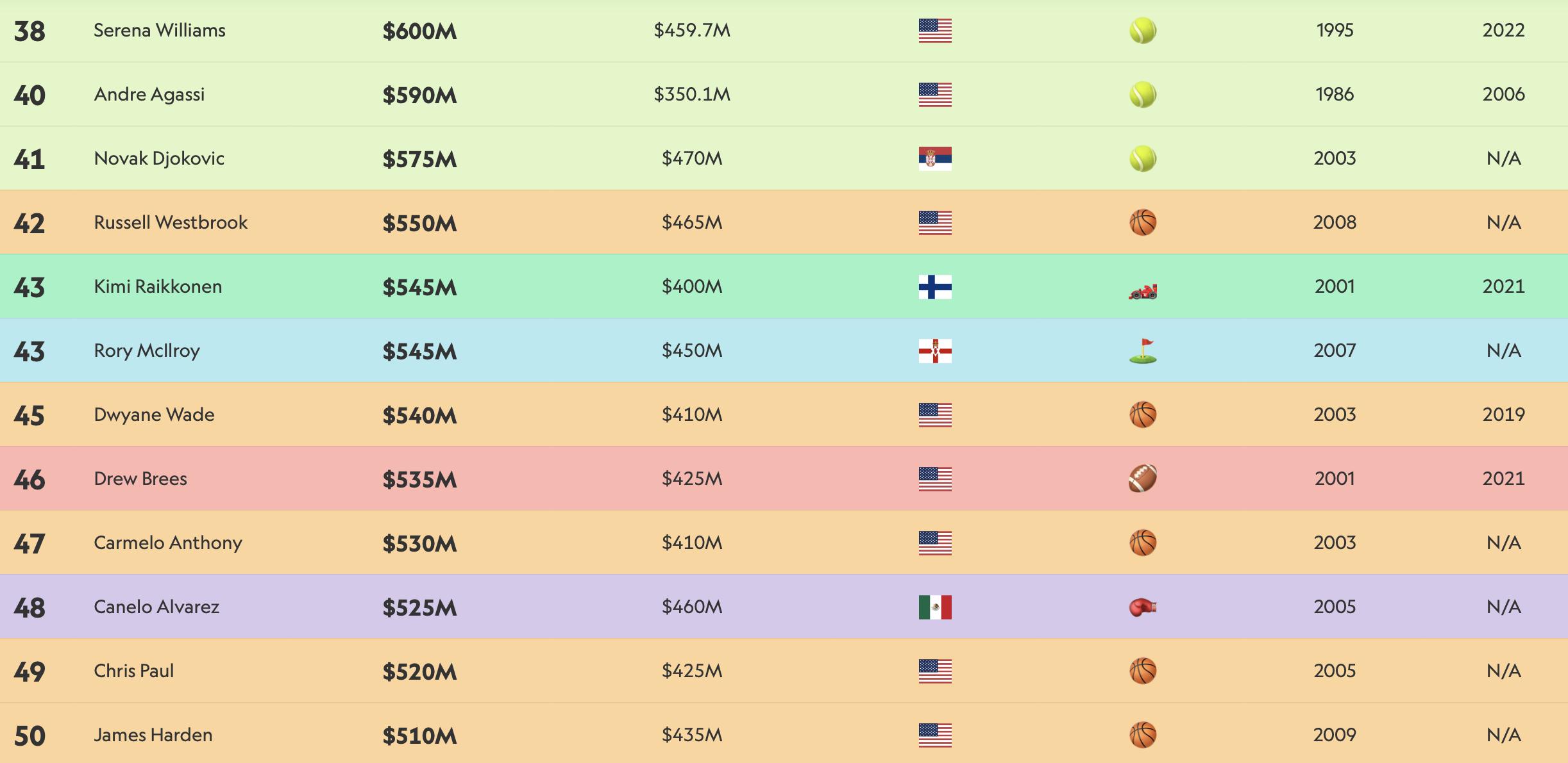 Ainsi, ces 50 athlètes ont rapporté un total combiné de 45,9 milliards de dollars après ajustement pour l’inflation et de 33,2 milliards de dollars sur une base nominale jusqu’à la fin de 2022. 9 sports différents sont représentés avec des sportifs venant de 17 pays à travers le monde.