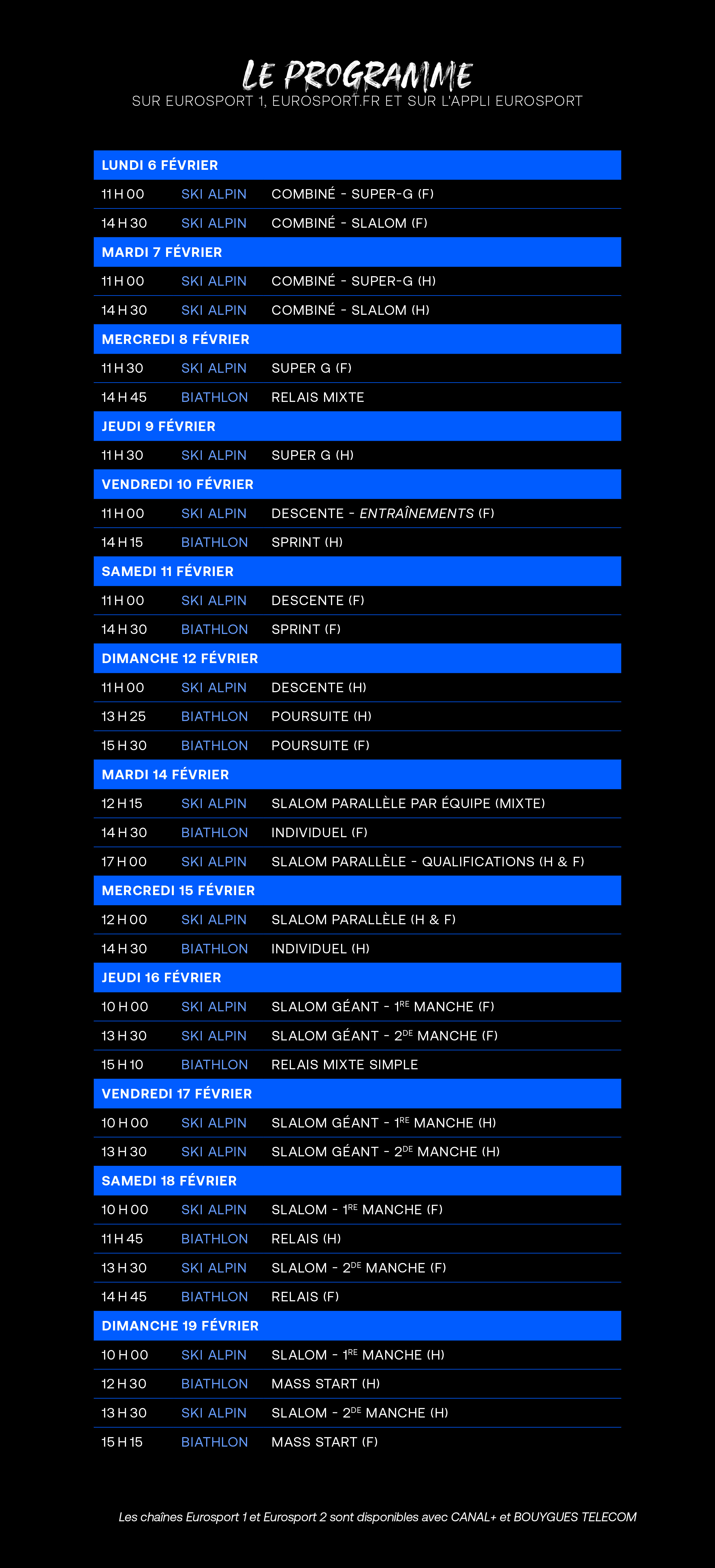 Sur France 2, France 3, France 4, france.tv et l’application francetvsport, vous retrouverez Alexandre Pasteur, Claire Vocquier-Ficot, Carole Montillet et Luc Alphand aux commentaires. Au total, France Télévisions annonce 30 heures de direct en télévision.