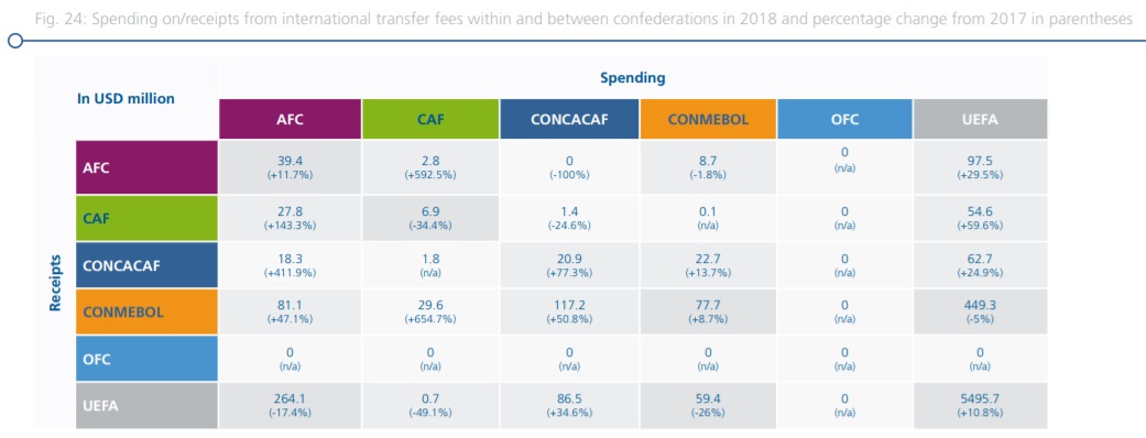 Les principales transactions ont été enregistrées entre pays membres de l’UEFA avec 5,495 milliards de dollars qui ont transité entre les clubs européens.