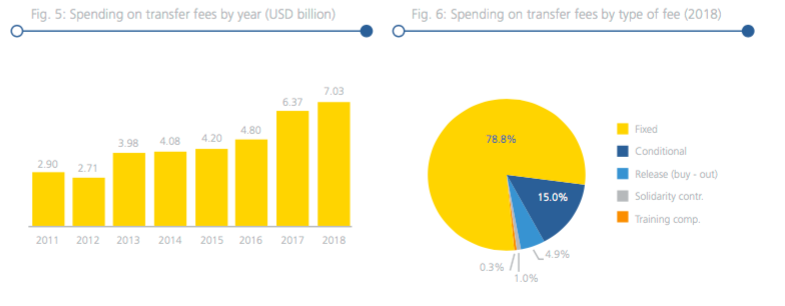 Dans son dernier rapport global, FIFA TMS annonce un total de 7,03 milliards de dollars dépensés par les clubs de football en indemnités de transferts internationaux, un chiffre en augmentation de 10,3% par rapport à 2017.
