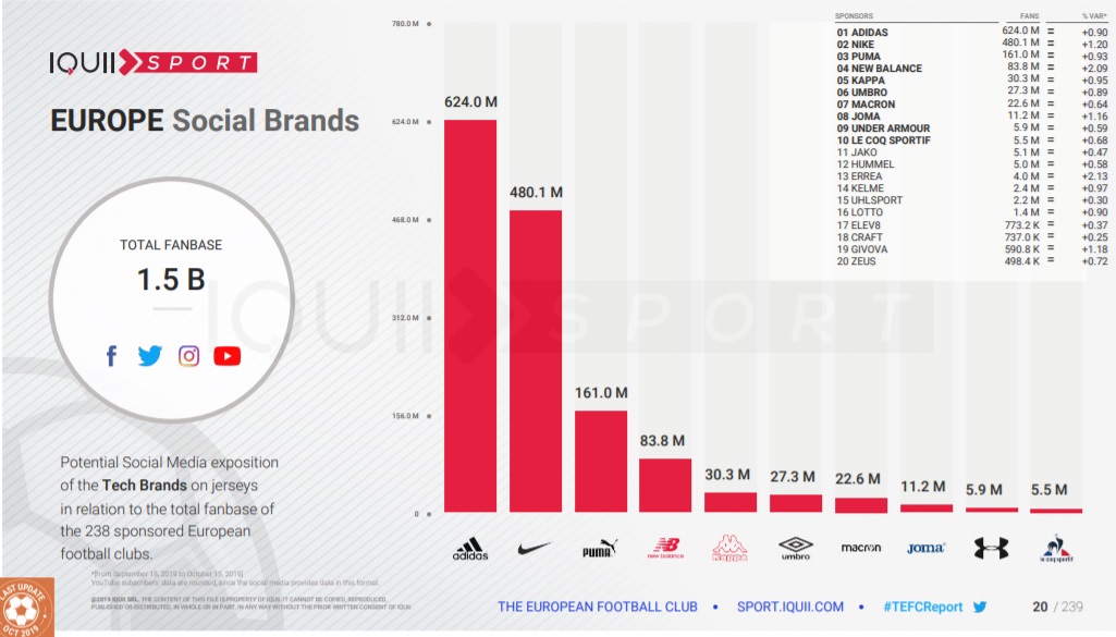 Derrière, on retrouve Nike (480,1M), Puma (161M), New Balance (83,8M), Kappa (30,3M), Umbro (27,3M), Macron (22,6M), Joma (11,2M), Under Armour (5,9M) et le coq sportif (5,5M).