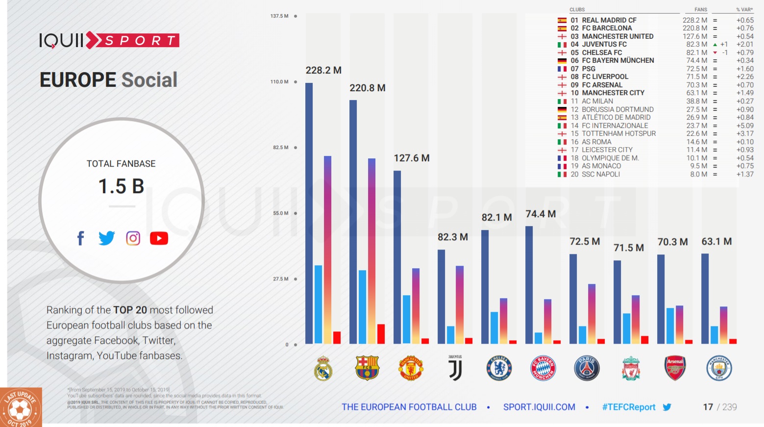 En analysant les comptes sociaux Facebook, Instagram, Twitter (compte principal) et YouTube, Iquii Sport mesure un total cumulé d’1,5 milliard de fans pour les 238 clubs au 15 octobre 2019. Un chiffre en augmentation d’1,07% par rapport au mois précédent.